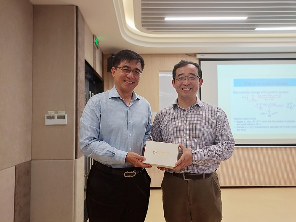 Prof. Shi Jin (right) is receiving a souvenir from Prof. Tao Tang (left)