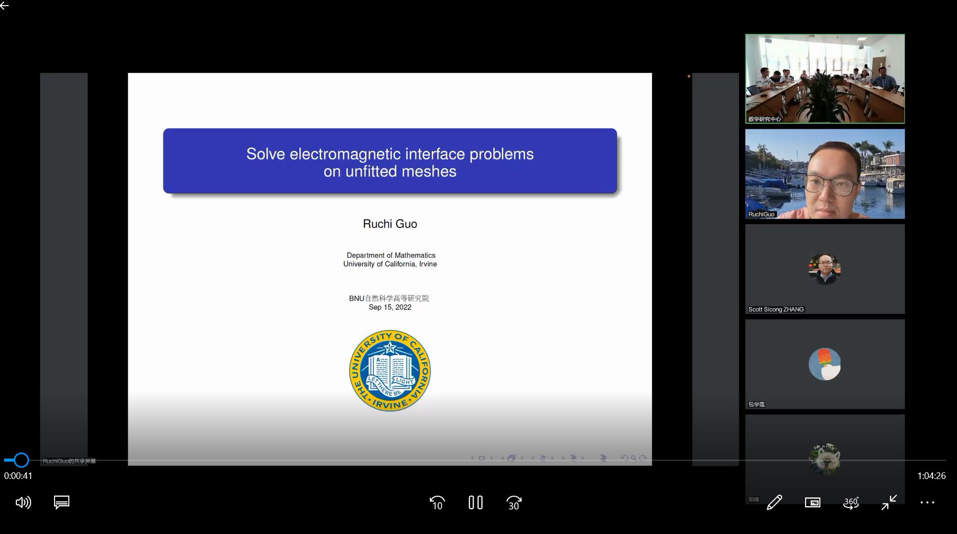 郭汝驰博士,于2019年在弗吉尼亚理工大学取得博士学位,后于俄亥俄州立大学担任Zassenhaus Assistant Professor,现于加州大学尔湾分校担任Visiting Assistant Professor。主要研究领域为科学计算,特别是针对偏微分方程的数值方法,包括界面问题的非匹配网格算法,以及界面反问题的重构算法,包括浸入有限元算法、虚拟元算法,以及反问题的优化算法、直接法和深度学习算法等。在 SIAM J. Numer. Anal., M3AS, SIAM J. Sci. Comput., J. Comput. Phys., IMA J. Numer. Anal., ESAIM:M2AN, J. Sci. Comput.等计算数学领域杂志上发表多篇文章。