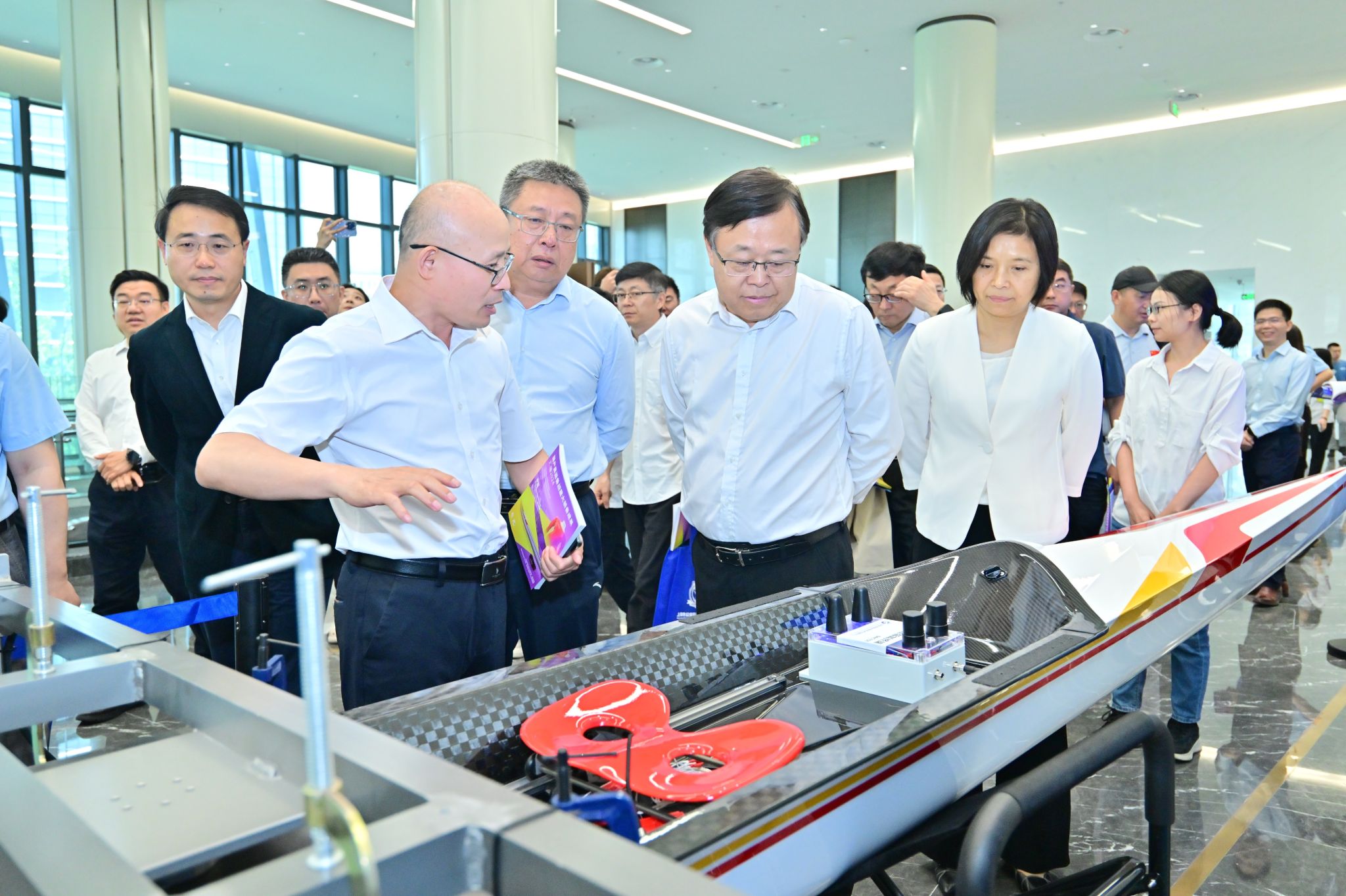 国家体育总局科教司司长陈志宇(右三),国家体育总局体育科学研究所党委书记、所长曹景伟(左三),国家体育总局体育科学研究所智慧体育创新研究中心主任李祥臣(左二)参观赛艇展位